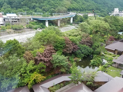 工場見学を終えて,懇親会は水上の温泉宿へ.温泉が3つもついている豪華で絶景な宿でした.