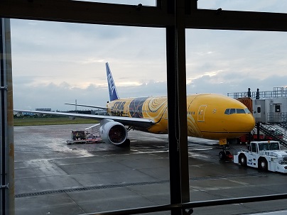 帰りの飛行機を待っていると,ゲートに一風変わった色の機体が!なんとスターウォーズ機に登場することができました!ラッキー!!