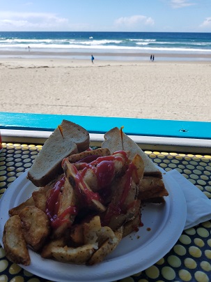 またアメリカの接着学会では,昼食は外で食べてこいというのが定番.太平洋を西側から眺めるビーチが徒歩1分にあったので,毎回ビーチでのランチとなりました.出てくる量がアメリカンサイズで食べきるのには苦労しましたが・・・